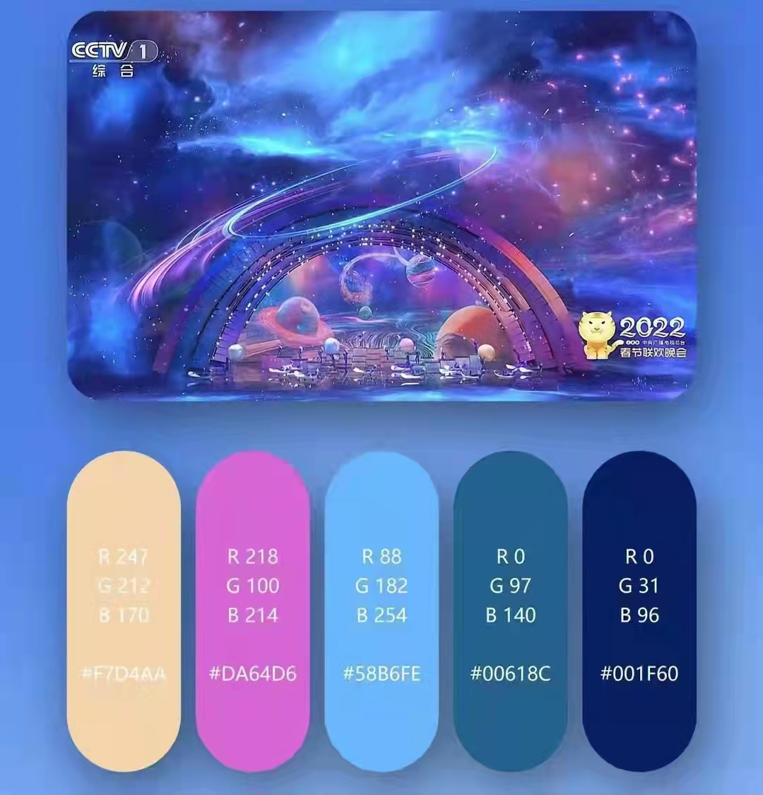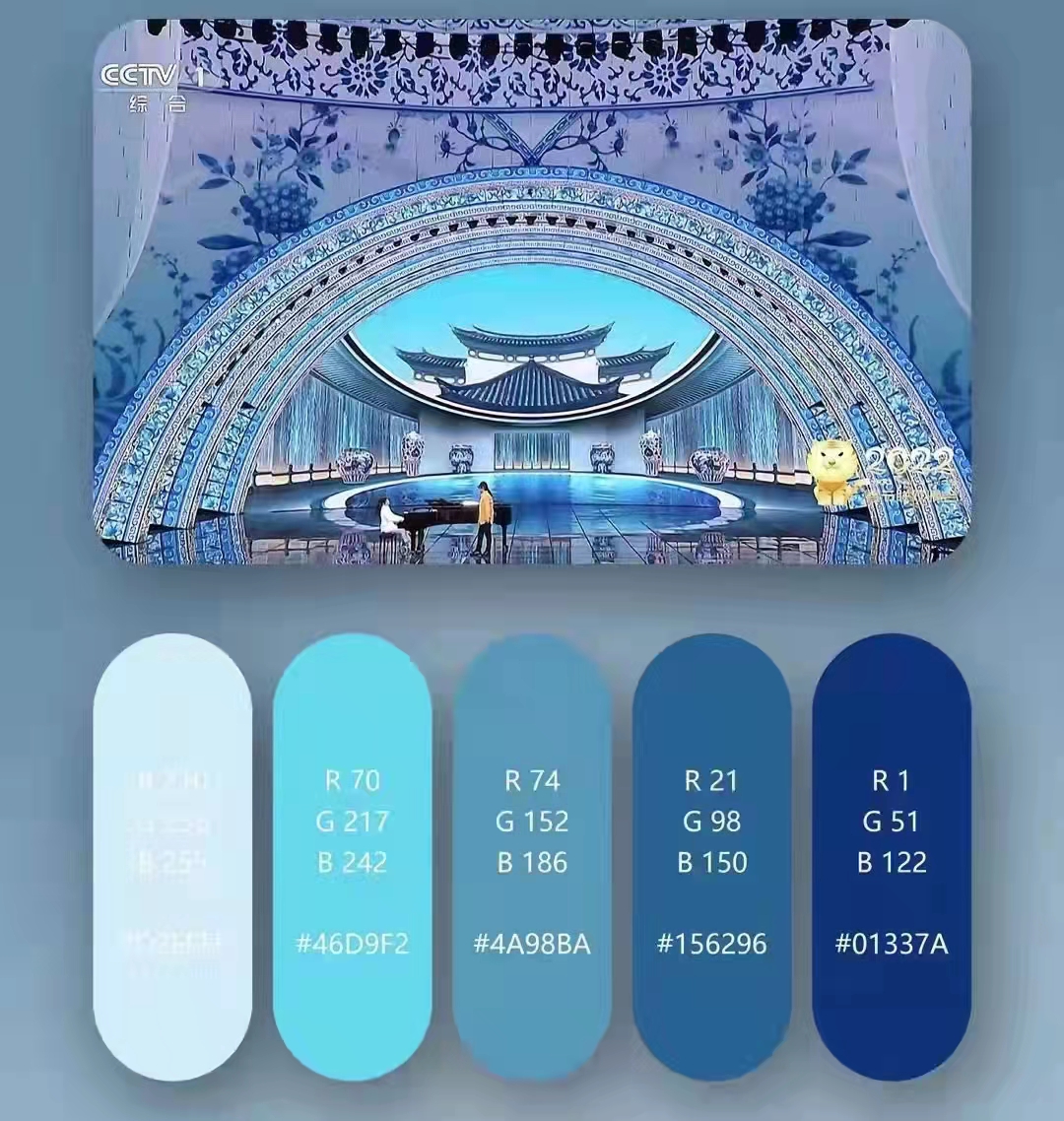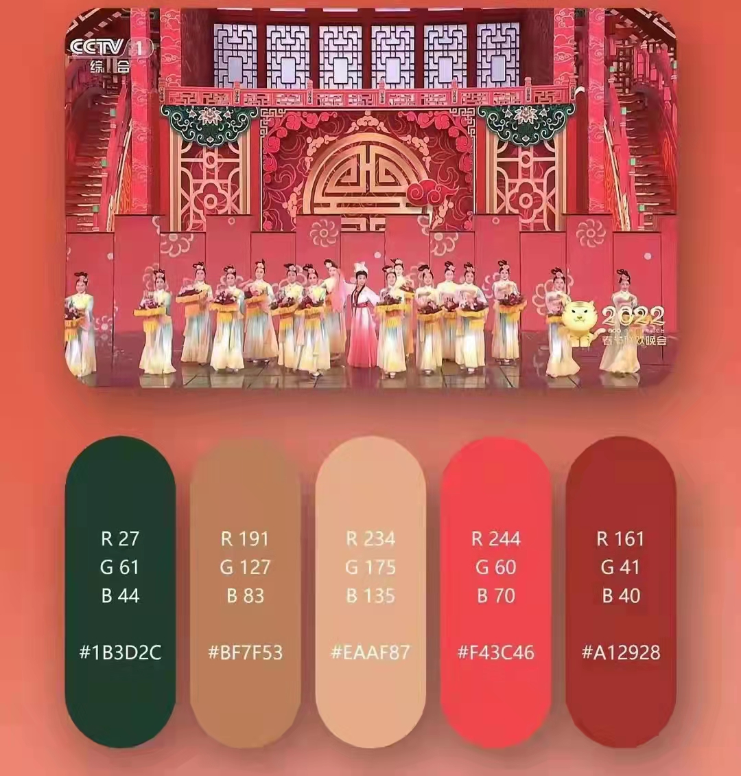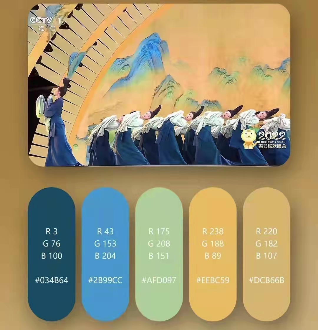 2022央视春晚的节目主题配色绝了,尽显了高级雅致的中国风。中华古典美有留白,有含蓄,画面有尽而意味无穷,纵使哀伤也不失优雅大气,它与传统式大红大绿的农家乐审美是不一样的。